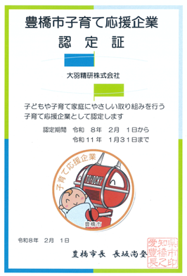 令和8年2月、当社は豊橋市より、子どもや子育て家庭にやさしい取り組みを行う企業として 「豊橋市子育て応援企業」 に認定されました。