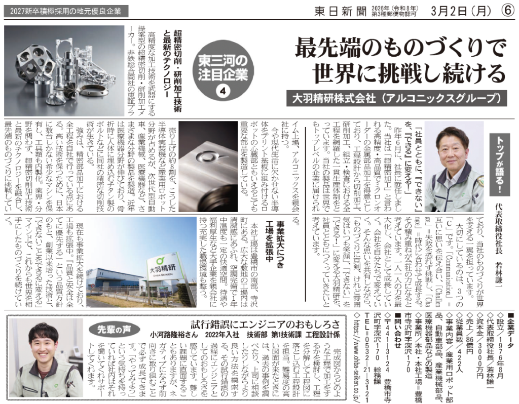 2026年3月2日発行の 東日新聞 にて、「2027新卒積極採用の地元優良企業」として掲載されました。